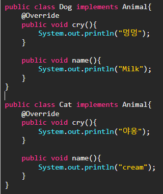 클래스는 확장한다는 의미의 키워드 'extends'를 사용하지만 인터페이스는 구현한다는 의미의 키워드 'implement'를 사용한다.