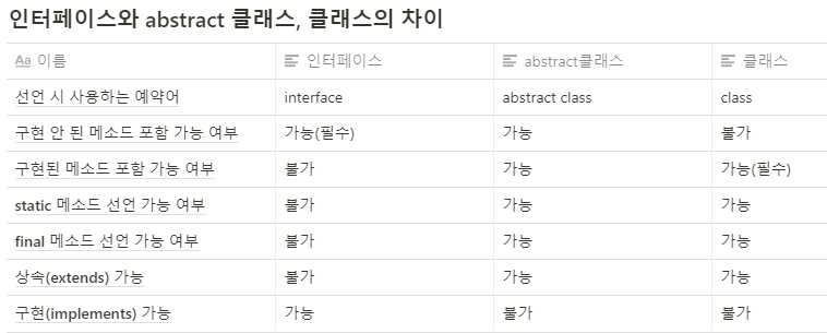 - 모든 메서드는 public abstract 이어야 하며, 이를 생략할 수 있다.(단, static 메서드와 디폴트 메서드는 예외)