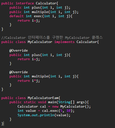 인터페이스가 default키워드로 선언되면 메서드가 구현될 수 있다. 또한 이를 구현하는 클래스는 default메서드를 오버 라이딩할 수 있다.