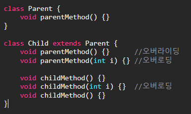 오버로딩(overloading) : 기존에 없는 새로운 메서드를 정의하느것(new)