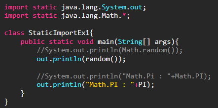 import문을 사용하면 클래스의 패키지명을 생략할 수 있는 것과 같이 static import문을 사용하면 static멤버를 호출할 때 클래스 이름을 생략할 수 있다. 특정 클래스의 static멤버를 자주 사용할 때 편리하다. 그리고 코드도 간결해진다