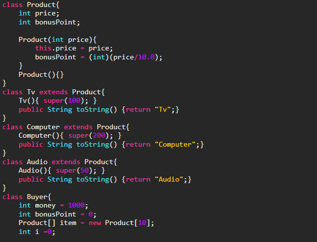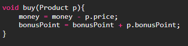 이렇게 되면 제품의 종류가 늘어날 때마다 Buyer클래스에는 새로운 buy 메서드를 추가해주어야 할 것이다. 그러나 매개변수에 다형성을 적용하면 아래와 같이 하나의 메서드로 간단히 처리할 수 있다.