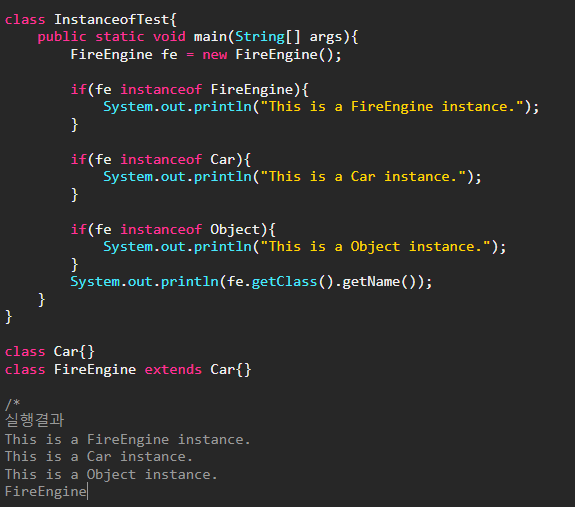 생성된 인스턴스는 FireEngine타입인데도, Object타입과 Car타입의 instanceof연산에서도 true로 결과를 얻었다. 그 이유는 FireEngine클래스는 Object클래스와 Car클래스의 자손클래스이므로 조상의 멤버들을 상속받았기 때문에, FireEngine인스턴스는 Object인스턴스와 Car인스턴스를 포함하고 있는 셈이기 때문이다.