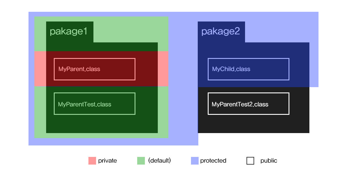 접근 범위가 넓은쪽에서 좁은 쭉의 순으로 나열하면 public > protected > (default) > private이다.