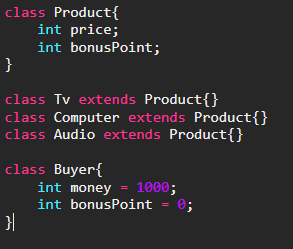 Product클래스는 Tv, Audio, Computer클래스의 조상이며, Buyer클래스는 제품(Product)을 구입하는 살마을 클래스로 표현한 것이다. Buyer클래스에 물건을 구입하는 기능의 메서드를 추가해보자. 구입할 대상이 필요하므로 매개변수로 구입할 제품을 넘겨받아야 한다. Tv를 살 수 있도록 매개변수를 Tv타입으로 하였다.