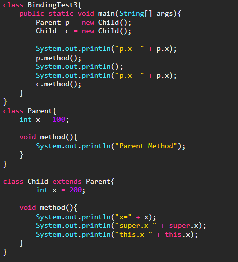 자손클래스 Child에 선언된 인스턴스변수 x와 조상 클래스 Parent로 부터 상속받은 인스턴스변수x를 구분하는데 참조변수 super와 this가 사용된다. 자손인 Child클래스에서의 super.x는 Parent에 선언된 인스턴스변수 x를 뜻하며, this.x또는 x는 Child클래스의 인스턴스변수 x를 뜻한다.