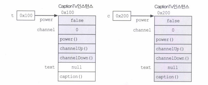 위 경우 실제 인스턴스가 Caption타입이라 할지라도, 참조변수 t로는 CaptionTv인스턴스의 모든 멤버를 사용할 수 없다. Tv타입의 참조변수로는 CaptionTv인스턴스 중에서 Tv클래스의 멤버들(상속받은 멤버 포함)만 사용할 수 있다. 따라서 생성된 CaptionTv인스턴스의 멤버 중에서 Tv클래스에 정의되지 않은 멤버, text, caption()은 참조변수 t로 사용이 불가능하다. (t.text t.caption()사용불가) 둘 다 같은 타입의 인스턴스지만 참조변수의 타입에 따라 사용할 수 있는 멤버의 개수가 달라진다.