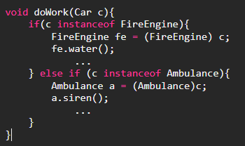 위 코드는 Car타입의 참조변수 c를 매개변수로 하는 메서드이다. 이 메서드가 호출될 때 매개변수로 Car클래스 또는 그 자손 클래스의 인스턴스를 넘겨받겠지만 메서드 내에서는 정확히 어떤 인스턴스인지 알 길이 없다. 그래서 instanceof연산자를 이용해서 참조변수 c가 가리키고 있는 인스턴스의 타입을 체크하고, 적절히 형변환다음에 작업을 해야 한다.