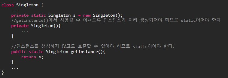 이처럼 생성자를 통해 직접 인스턴스를 생성하지 못하게 하고 public메서드를 ㅌ오해 인스턴스에 접근하게 함으로써 사용할 수 있는 인스턴스의 개수를 제한할 수 있다. 또한 생성자가 private인 클래스는 다른 클래스의 조상이 될 수 없다. 생성자의 접근 제어자가 private이므로 자손클래스에서 호출하는 것이 불가능하기 때문이다. 그래서 클래스 앞에 final을 더 추가하여 상속할 수 없는 클래스라는 것을 알리는 것이 좋다.