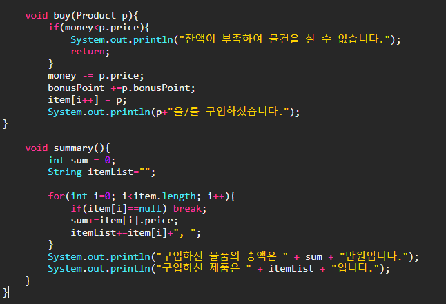 Buy클래스에 물건을 구입하는 기능의 메서드를 추가하면 구입할 대상이 필요하므로 매개변수로 구입할 제품을 넘겨받아야 한다.