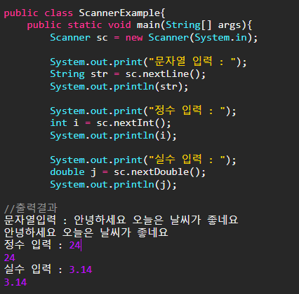 Scanner 클래스에서 3개의 메소드를 사용해보았는데 각각 메소드에 맞게 알맞는 데이터 타입의 값으로 리턴해준다. 이 중 문자열을 입력받아 리턴하는 nextLine()메소드가 많이 쓰인다. 이 메소드는 String타입으로 리턴해주는데 이것과 같은 타입의 메소드로 nxet()가 있다.