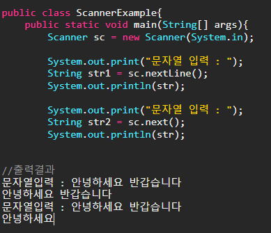 위 코드를 보면 next()메소드는 '안녕하세요'만 반환한것을 알 수 있다. nextLine()과 next()메소드의 차이는 nextLine()메소드는 공백 문자와 상관 없이 콘솔 창 한 줄(Line)에 있으면 모두 문자열로 인식해서 Enter를 치기 전까지 쓴 문자열을 모두 리턴한다는 것이고 next() 메소드는 토큰의 개념으로 문자열을 입력받는데, 스페이스 즉 공백 전까지 입력받은 문자열을 리턴한다는 것이다. 그래서 공백이 있는 문자열 한줄을 리턴받고 싶으면 nextLine() 메소드를 사용하고 그냥 한 단어만 쓰고 싶다면 next()를 쓰는 것이지만 nextLine()을 써도 상관 없다.