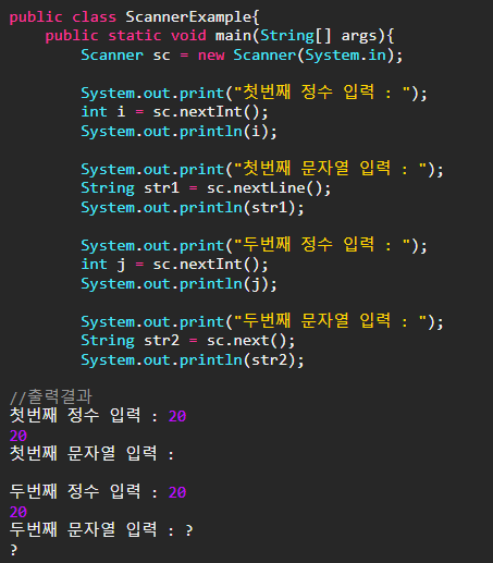 그래서 '첫번째 문자열 입력 : '이 넘어가고 '두번째 정수 입력 : '이 출력된 것이다. 만약 정수를 입력하고 그 다음 문자를 입력하려고 할 때 next()메소드를 사용하여야 한다. 아니면 위에 nextLine메소드를 한번 더 써줘서 enter값을 없애줘야 한다. 다른 방법으로는 정수를 nextLine()으로 입력받고 Integer.parseInt()로 변환해서 사용하는 것이다..