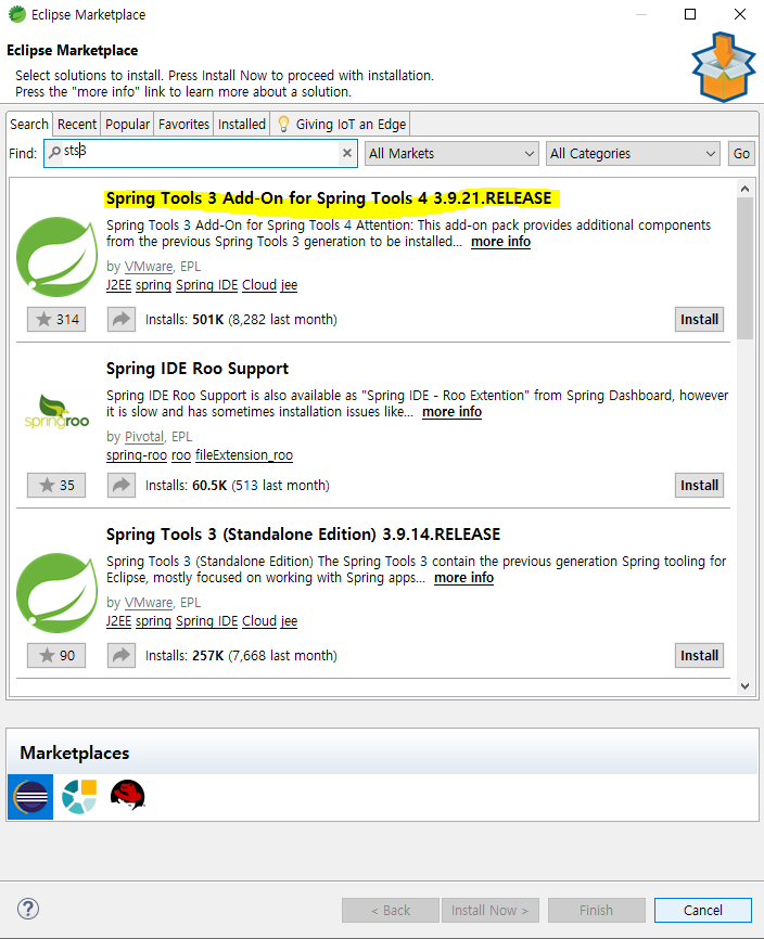 상단 메뉴의 Help탭에서 Eclipse Marketplace 에서 sts3를검색 후