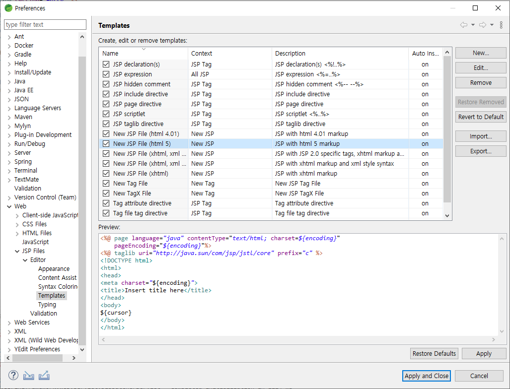 Web - JSP Files - Editor - Temlates에서 NEW JSP File(html 5)에
