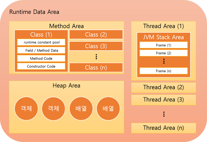 메서드 영역(Method Area), 스레드 영역(Thread Area), 힙 영역(Heap Area)과 같이 세부 영역으로 구분을 해서 사용한다.
