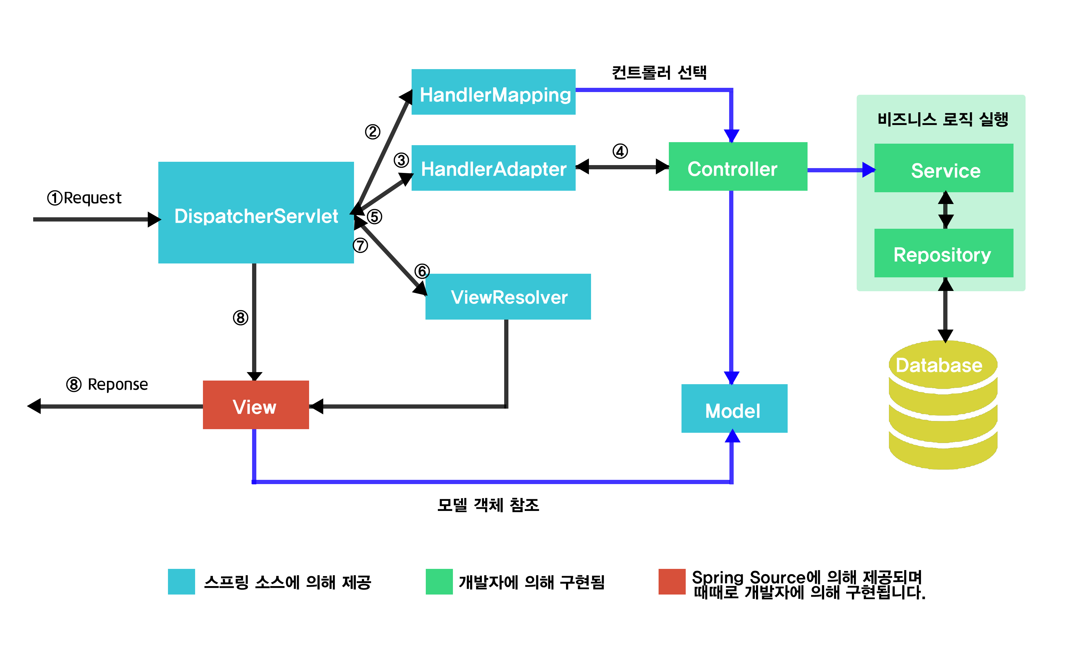 -View반환 : ViewResolver는 View의 논리 이름을 물리 이름으로 바꾸고 렌더링 역할을 담당하는 View객체를 반환한다