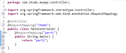 -아래와 같이 작성되었다면 "루트/Home"경로로 접속을 시도하면 해당 컨트롤러가 담당을 하고 그 아래 main메소드는