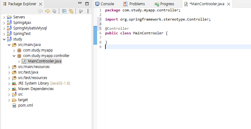 -프로젝트의 src/main/java 안에 컨트롤러만 모아둘 패키지 com.정해둔.이름의 패키지.controller를 생성하고 패키지 안에MainController라는 이름의 java클래스를 생성한다.