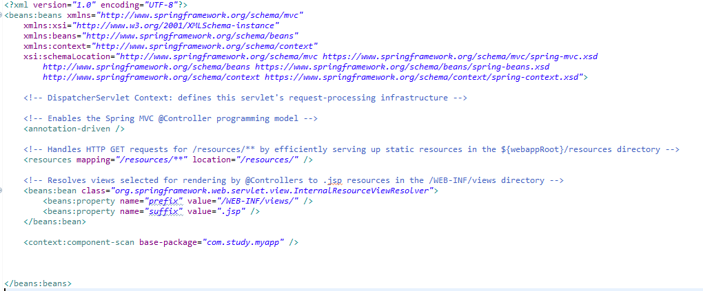 -context:component-scan부분은 스프링이 스캔할 경로를 지정해주는 것이다. 기본적으로 프로젝트를 생성할 때 만든 가장 상위 패키지의 이름으로 되어있고 그 아래 작성된 contoller 패키지도 탐색 범위에 포함된다.