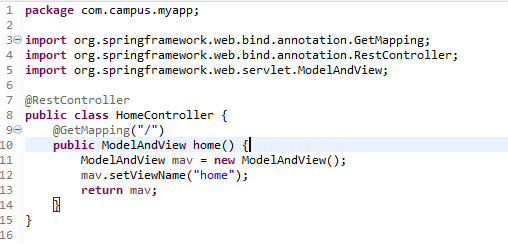 -HomeController를 스프링과 동일하게 만들어주고 home.jsp를 만들어주고 실행한다