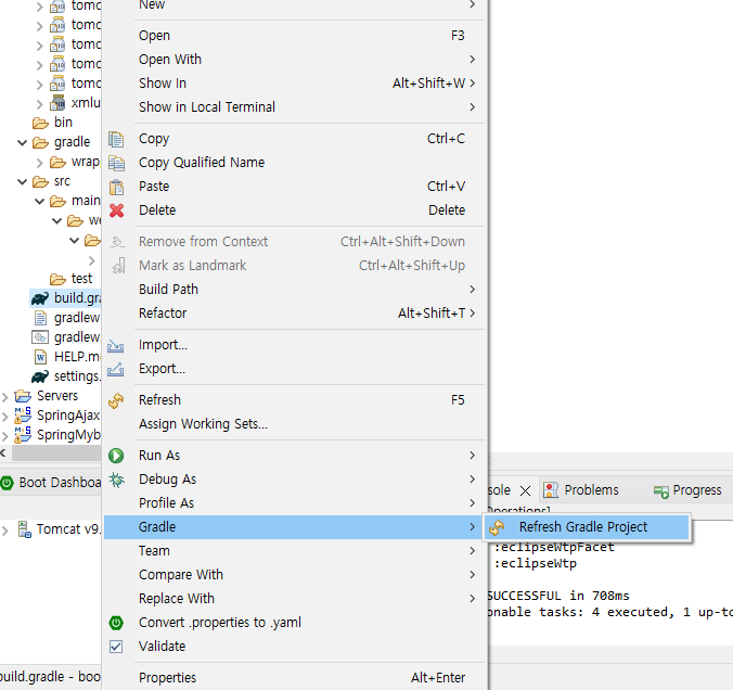 -Build Gradle우클릭 후 gradle - Refresh Gradle Project를 선택해야 해당 프레임워크가 설치됨(스프링에서는 저장만 하면되지만 스프링 부트는 저장 후 이 작업을 해주어야함)
