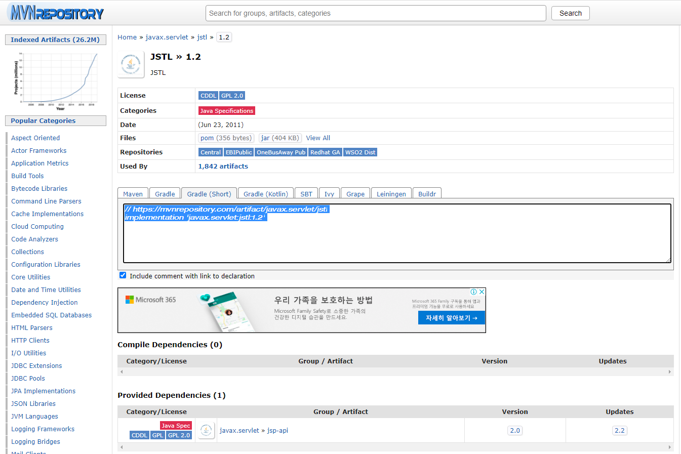 -jstl을 사용하려면 동일하게 JSTL을 검색후 javax.servlet>jstl의 최신버전의 소스를 가져와서 build Gradle의 dependencies 안에 붙여넣기 한다.