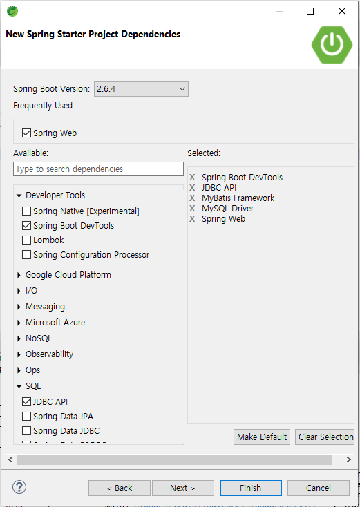 -SQL 아래의 JDBC API, MyBatis Framework, MySQL Driver, Spring Web 사용할 5가지를 선택한 후 Finish를 누른다.(이 작업에서 누락되어도 Build Gradle의 dependencies에서 추가할 수 있음)