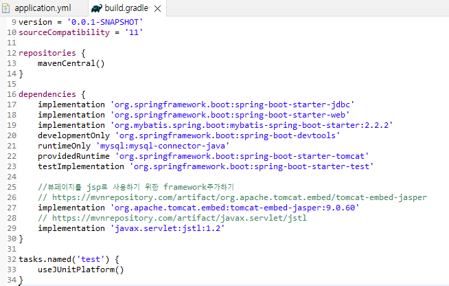 -main/webapp/WEB-INF/views 하위 폴더를 생성하고 src/main/resources에 application.yml파일을 만들어주고 Build Gradle에 뷰페이지를 JSP로 사용하기 위한 프레임워크를 dependencies안에 추가해준다