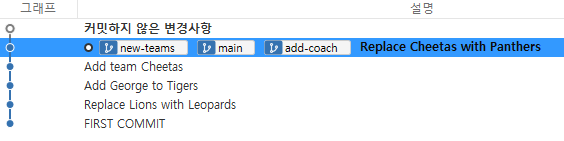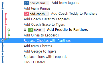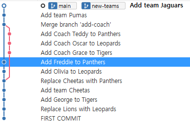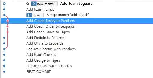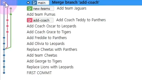 -main을 new-teams위치로 옮겨주기 위해서 merge를 해야 한다 -> git merge new-teams