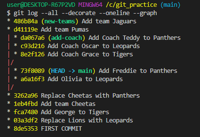 -각 브랜치에서 수정, 파일 생성 후 각각 커밋을 하고 그 내역을 git log에서 각 branch마다 다르게 살펴볼 수 있고, 여러 브랜치의 내역을 편리하게 보려면 git log --all --decorate --oneline --graph로 확인할 수 있다.(텍스트)