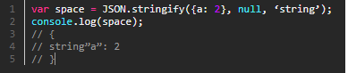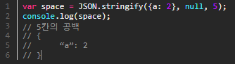 #space(선택) : 가독성을 목적으로 JSON문자열 출력에 공백을 삽입하는데 사용되는데 , string이나 number객체가 될 수 있다. 이 밗이 null이거나, 제공되지 않으면 공백이 사용되지 않는다.