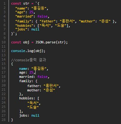 ex) JSON문자열을 변수 str에 저장 후 JSON.parse()메서드에 str인자를 넘겨서 console에 호출