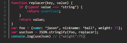 #replacer(선택) : 함수 또는 배열. 이 값이 null 이거나 제공되지 않으면 객체의 모든 속성들이 JSON문자열 결과에 포함된다.