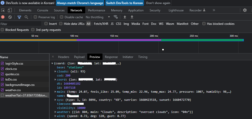 -해당 URL을 fetch()를 사용해서 실제 URL에 갈 필요 없이 Javascript로 하여금 대신 URL을 부를 수 있다. 그렇게 되면 F12를 눌러 나오는 검사 영역에서 Network - Name에 URL을 클릭 후 Preview에 들어가면 아래와 같은 결과를 얻을 수 있다.