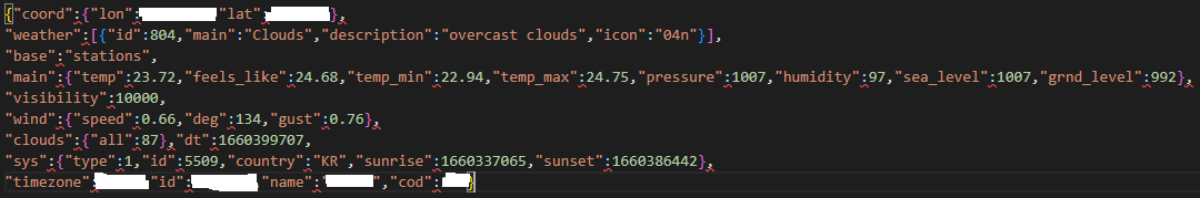 -Geolocation 으로 알아낸 좌표를 lat lon에 각각 적어주고 My API keys에서 알아낸 API키를 주소창에 적고 실행시키면 아래와 같은 정보를 확인할 수 있다.