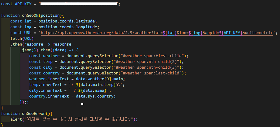 노마드 코더 바닐라js 강의중 해당 위도, 경도를 가지고 날씨를 나타낼 수 있는 API를 사용하는 법을