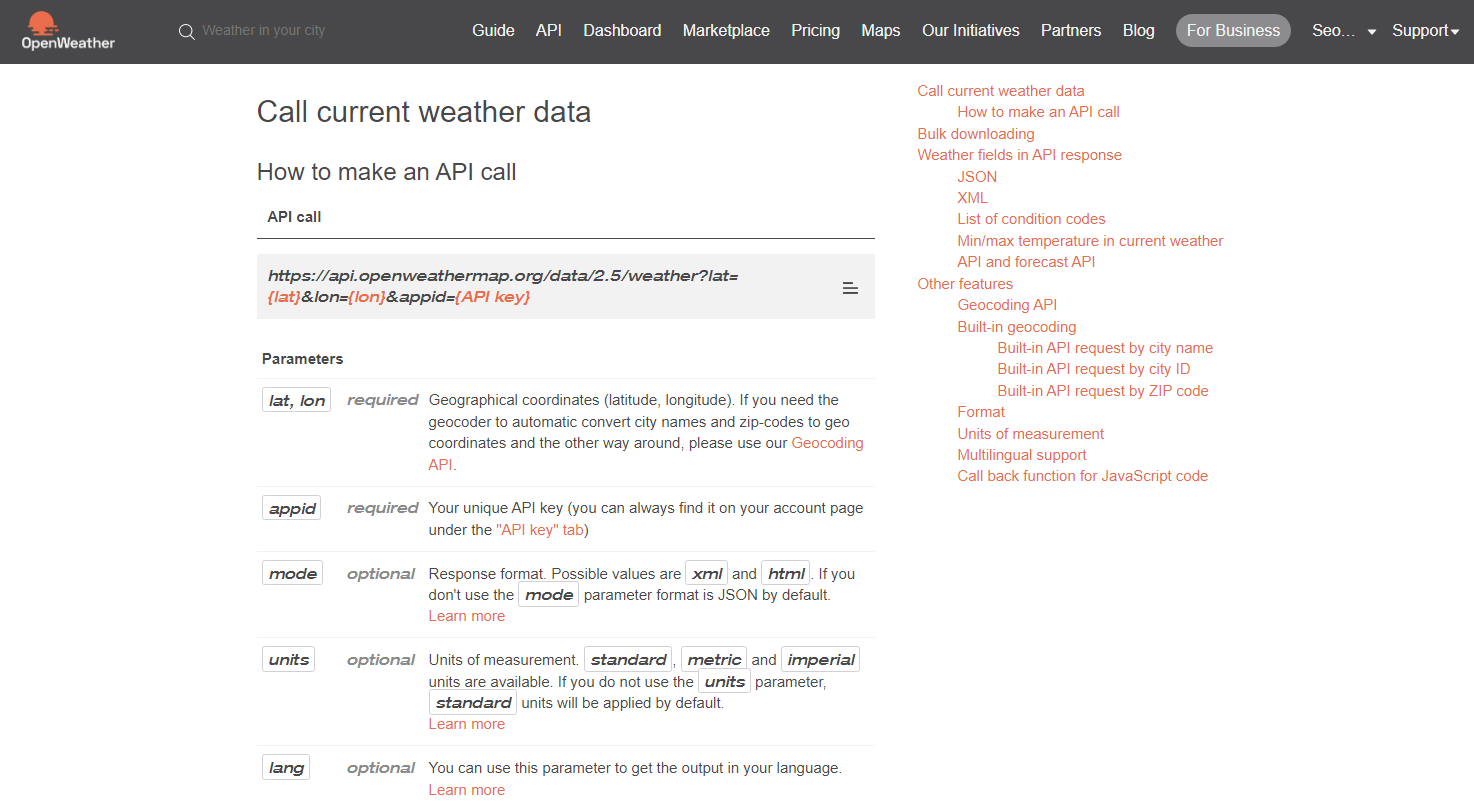 -상단의 API탭을 클릭 후 우리가 사용할 Current Weather Data API를 찾아서 API doc 클릭한다.