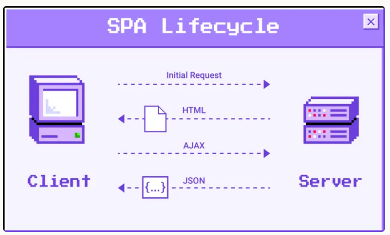 - 새로운 페이지를 요청할 때마다 서버에서 렌더링된 정적 리소스(HTML, CSS, JavaScript)가 다운로드된다